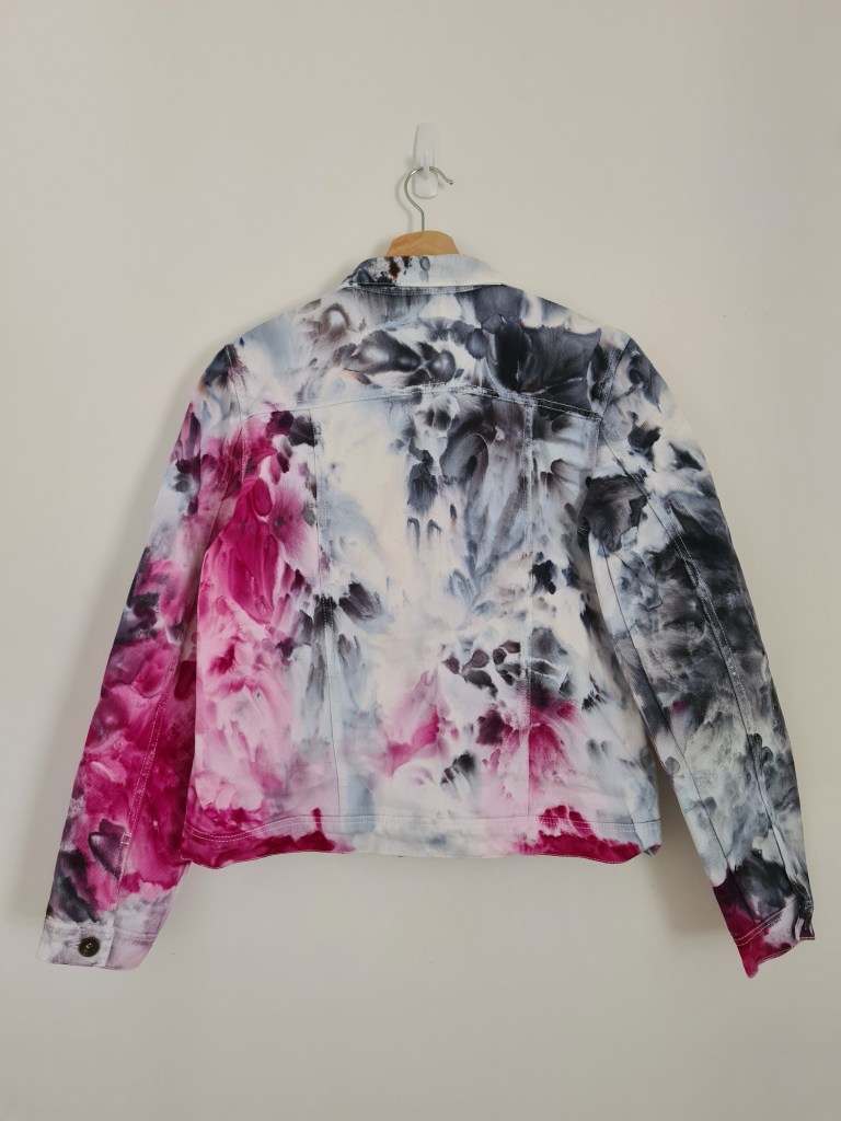 Vibrant Ice Dyed Denim Jacket from the Upcycled Collection. Blending style and sustainability, this jacket has been transformed into a unique and bold statement piece.